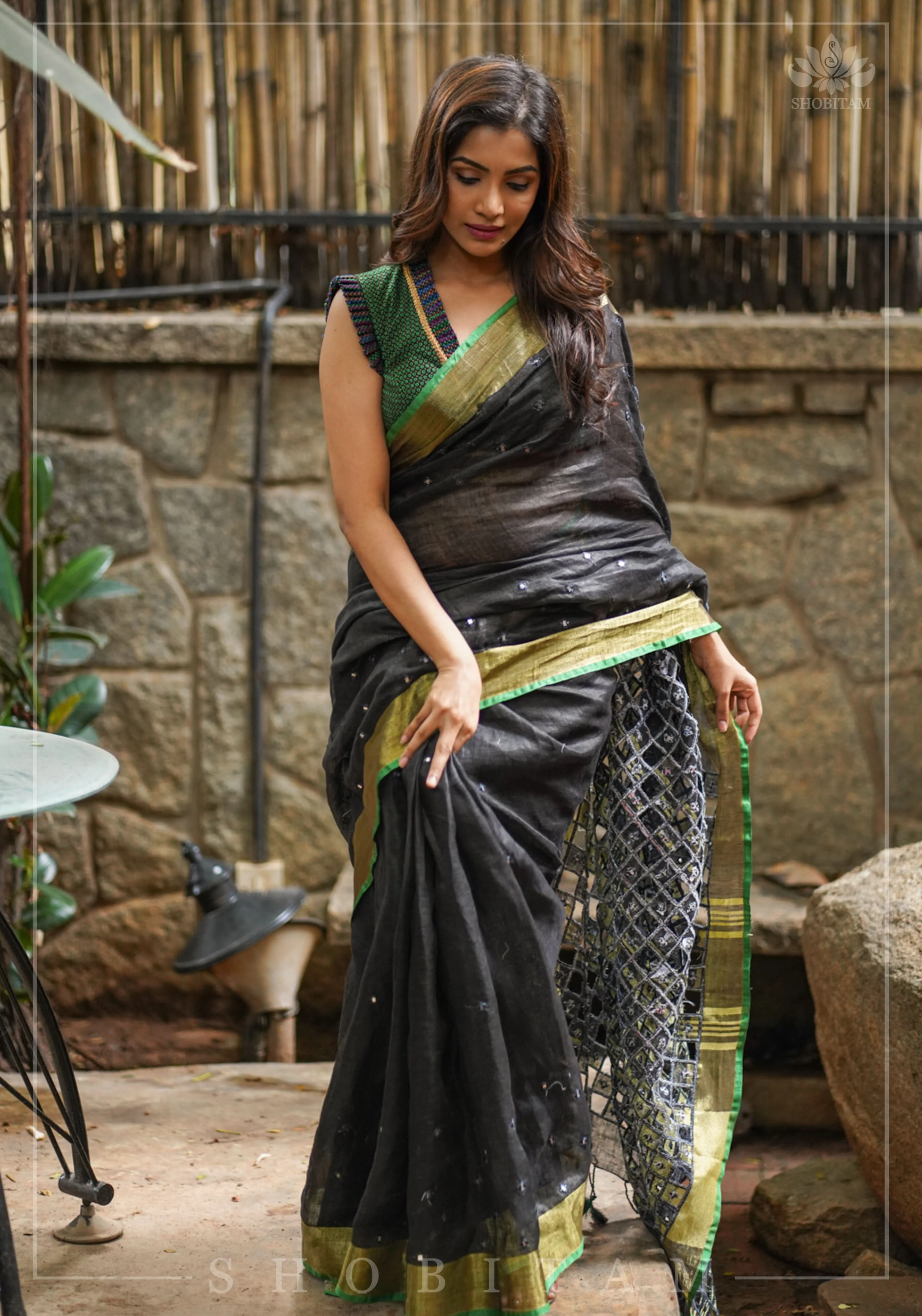 Cutwork Linen Saree in Black with Green borders | Shobitam