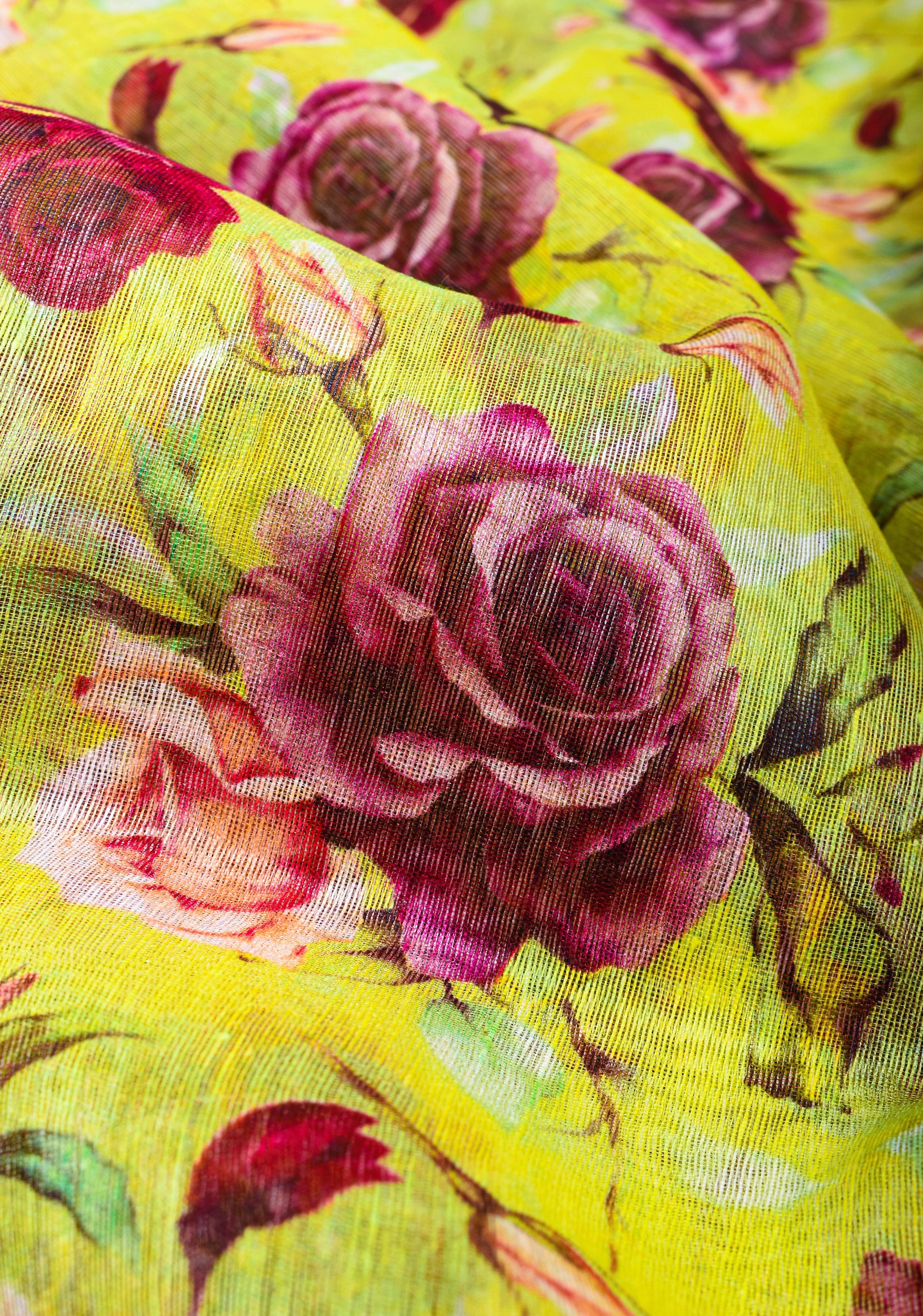Citrine Silk Linen Saree with Rose Floral Digital print, zari borders and long tassels | Shobitam