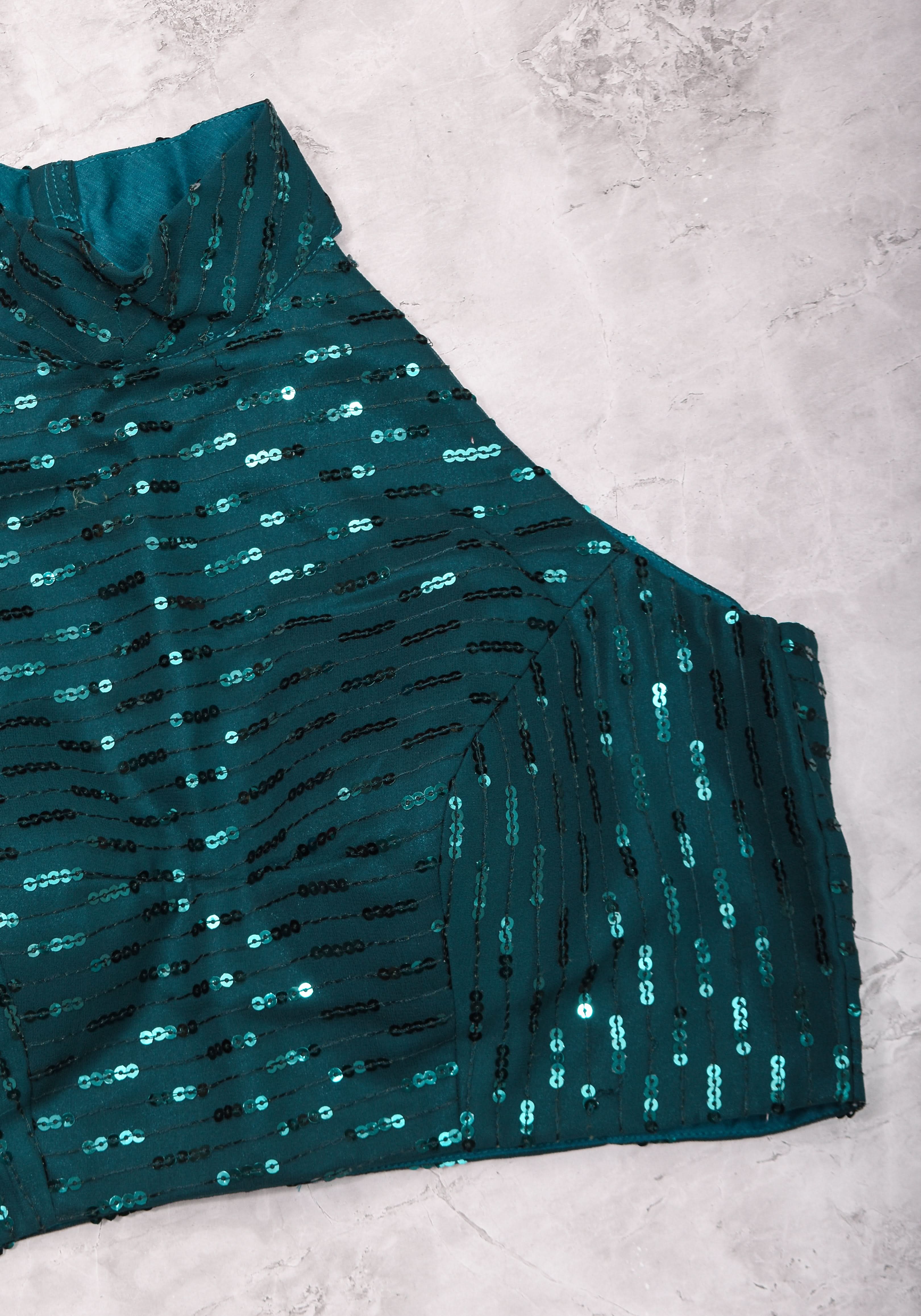 A versatile and glam blouse that can be paired with sarees or worn as a crop top over lehengas. This blouse in deep teal shimmers with sequins! It comes in a Raglan line, collar neck and traingle back cutout design!Â
