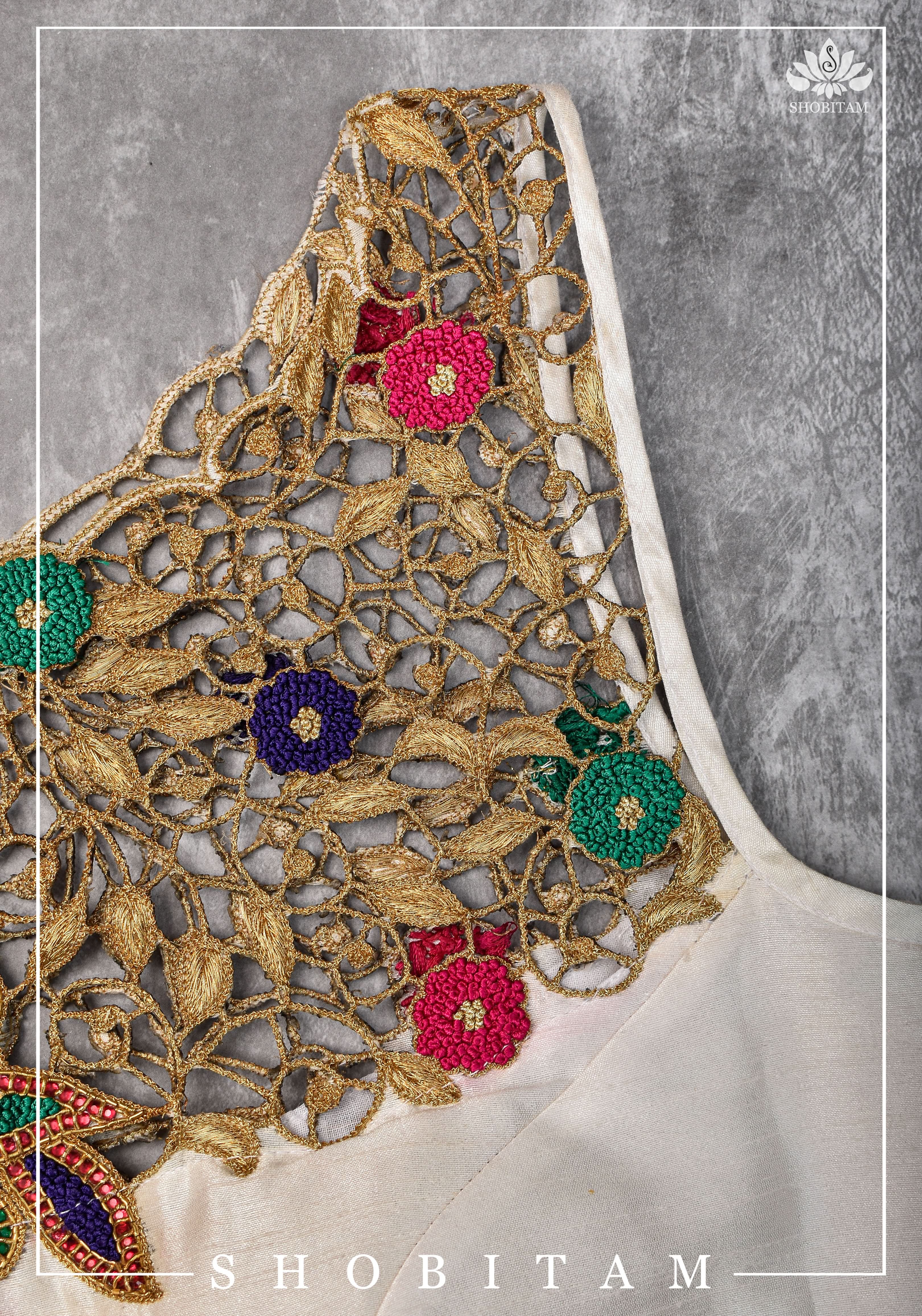 Make your own size: Hand Cutwork Yoke raw Silk Blouse with meenakari resham |Shobitam Blouse