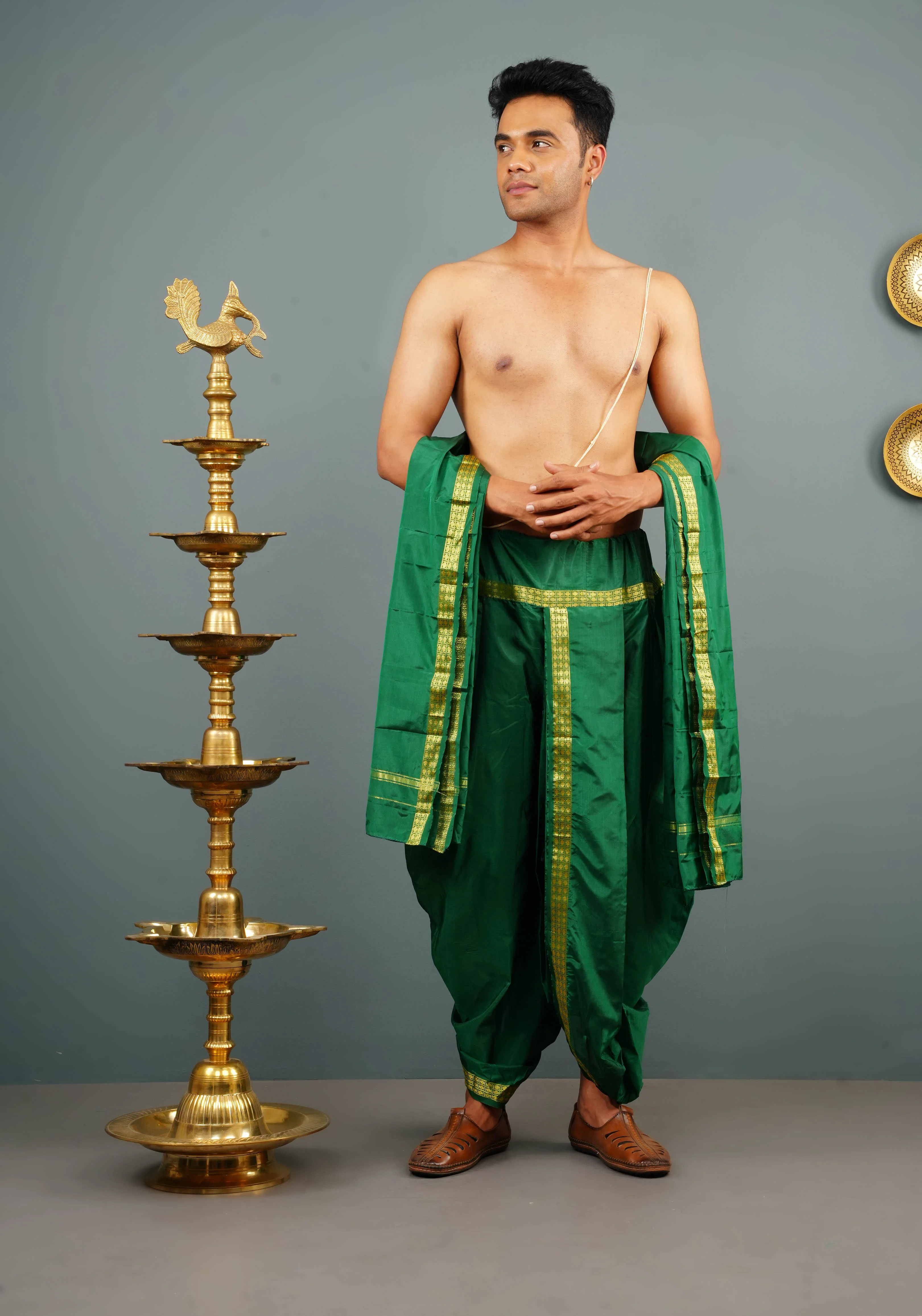 Exude Traditional Elegance in all your special occasions with this exquisite Emerald Green Tattva Dhoti and Angavastram. The Dhoti is prestitched for comfort!