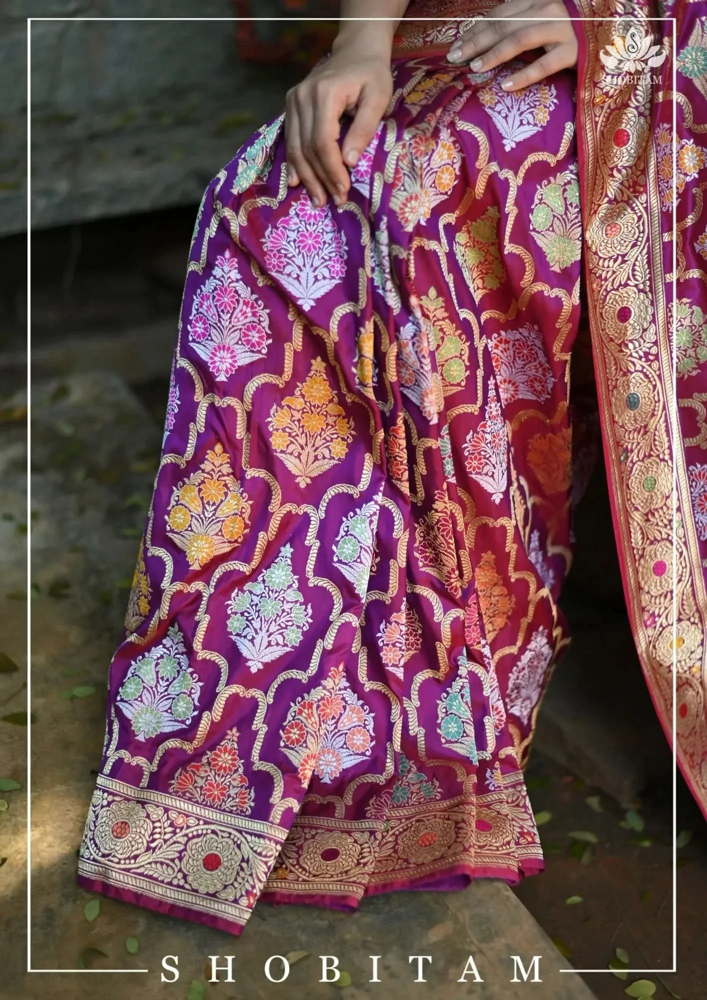 Authentic Kadhuwa Jungla Multi-color Meenakari Jaal Banarasi Silk Saree in Plum with Grand Pallu and Zari | SILK MARK CERTIFIED | Shobitam