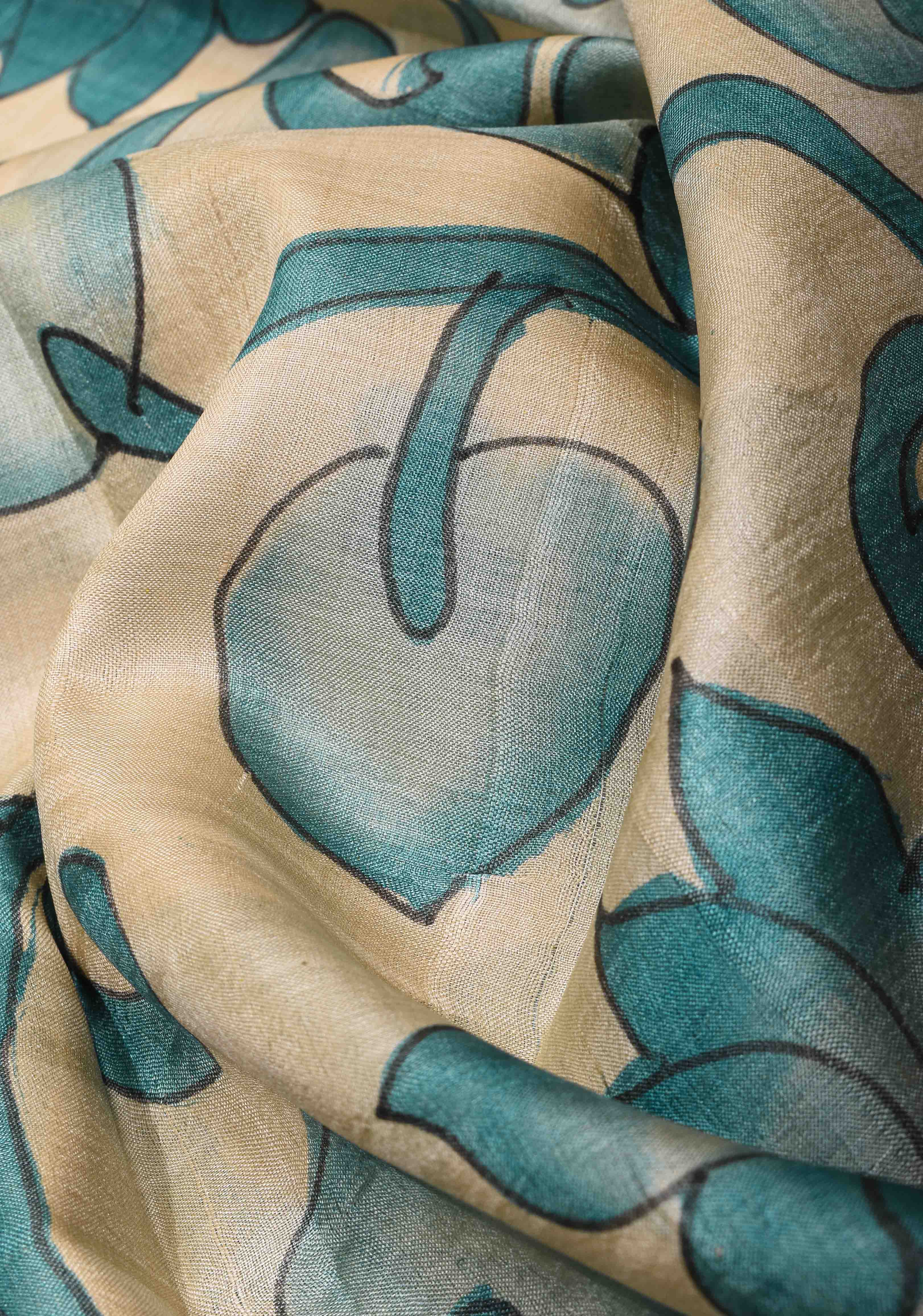 Beige Jari Tussar Saree with Hand Painted Kalamkari Floral Vines and Zari Border | SILK MARK CERTIFIED | Shobitam