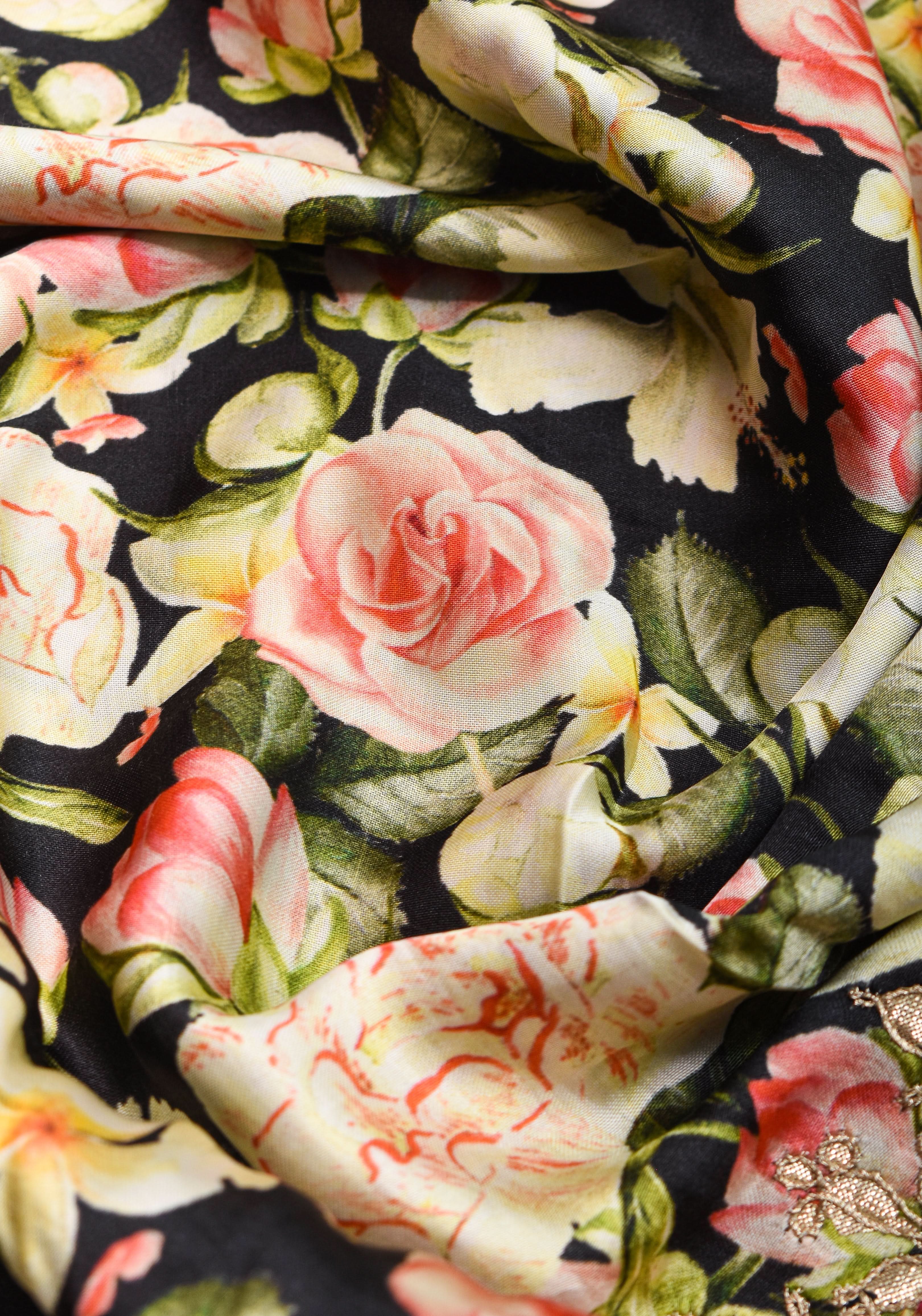 You'll be amazed at the dazzle and sparkle that Rajasthan's Gotta Patti technique can bring to your special occasion outfits! This unique applique technique features metallic trims sewn onto the garment in one-of-a-kind designs. Originally created for royalty, this time-tested technique is now a coveted fashion statement! This Gajji Silk Saree in Black is silky smooth and boasts a vibrant digital floral print. Plus, the gotta patti border adds a touch of glamour that's sure to turn heads.