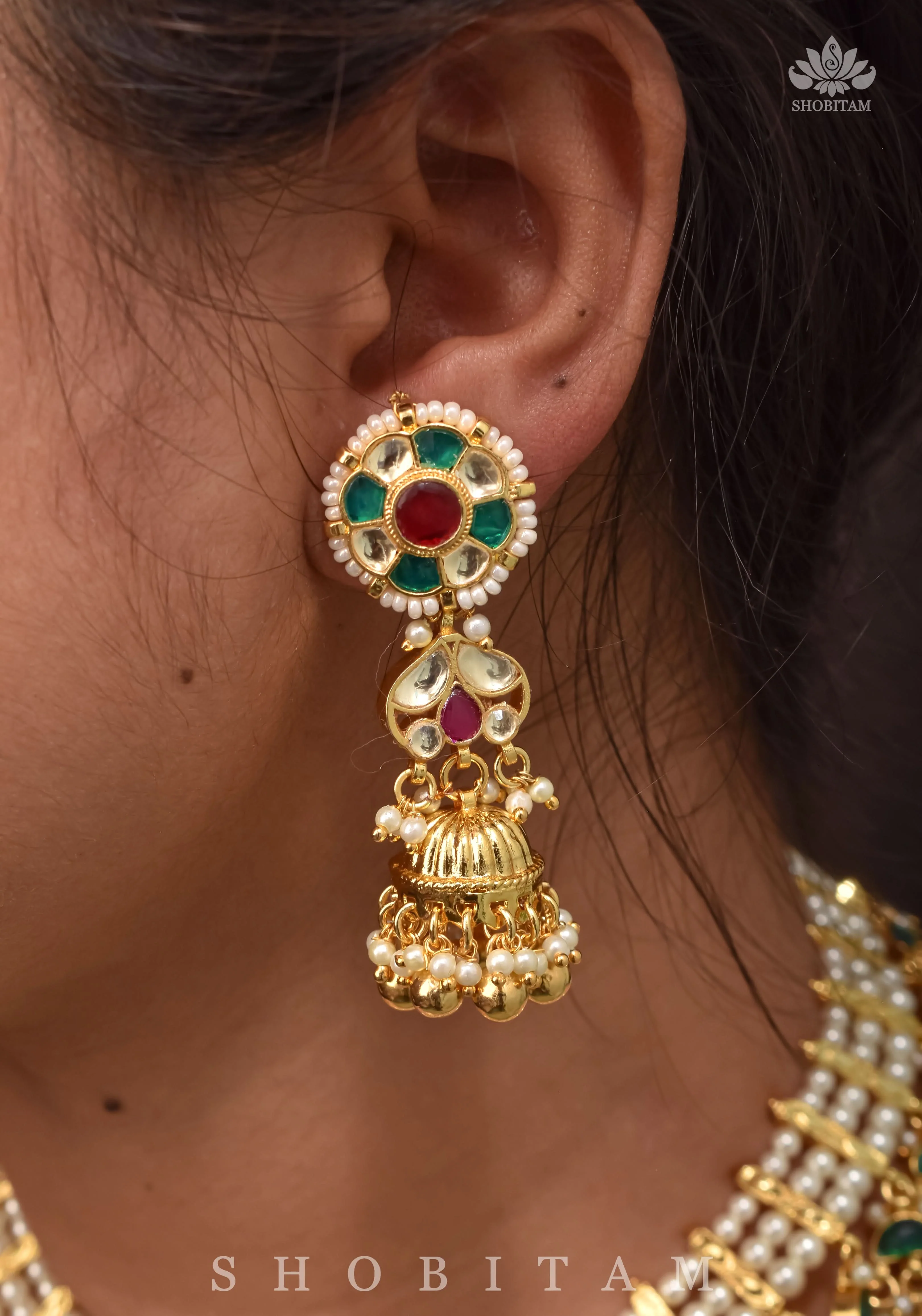 Interacting with rice pearl stones and gold tone base, this set will transport you to the Royal era of yore! Pretty kundan units are suspended from 3 units of charming white beads.