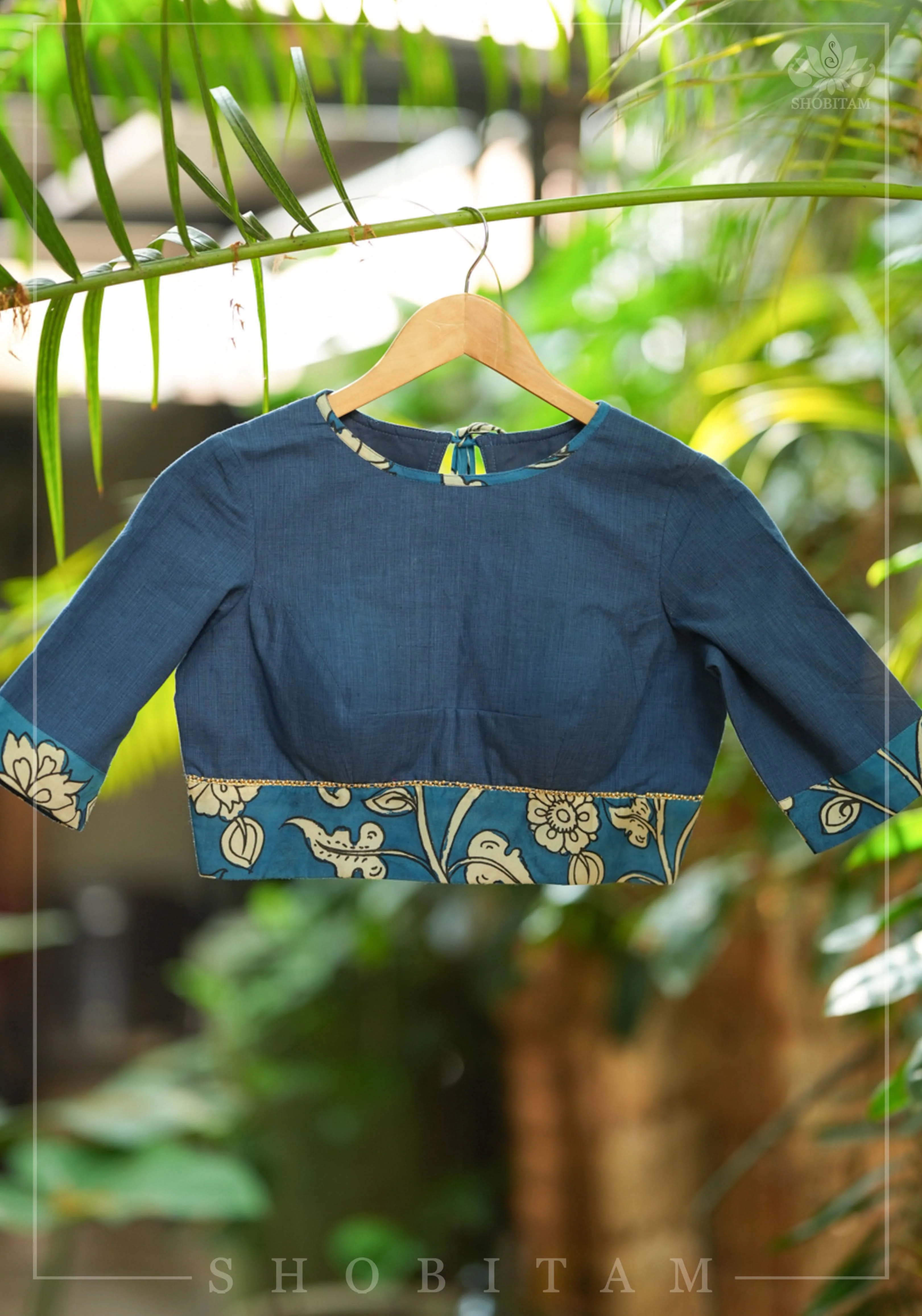 Hand painted Kalamkari borders make this blue blouse in cotton a charmer and easy pairing for many sarees!