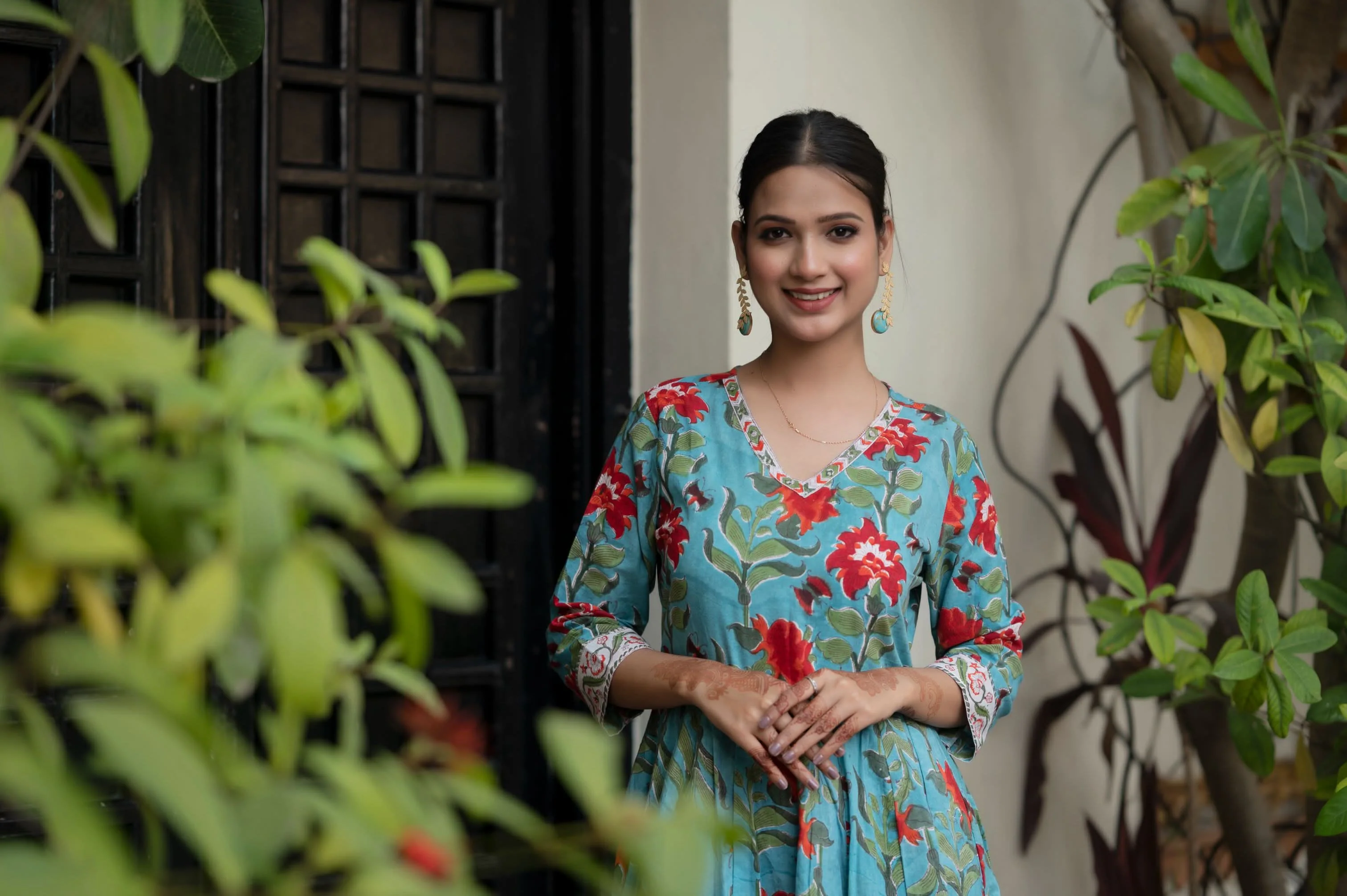 6 Meter Flare Long Dress in Blue and Coral | Shobitam Made To Order