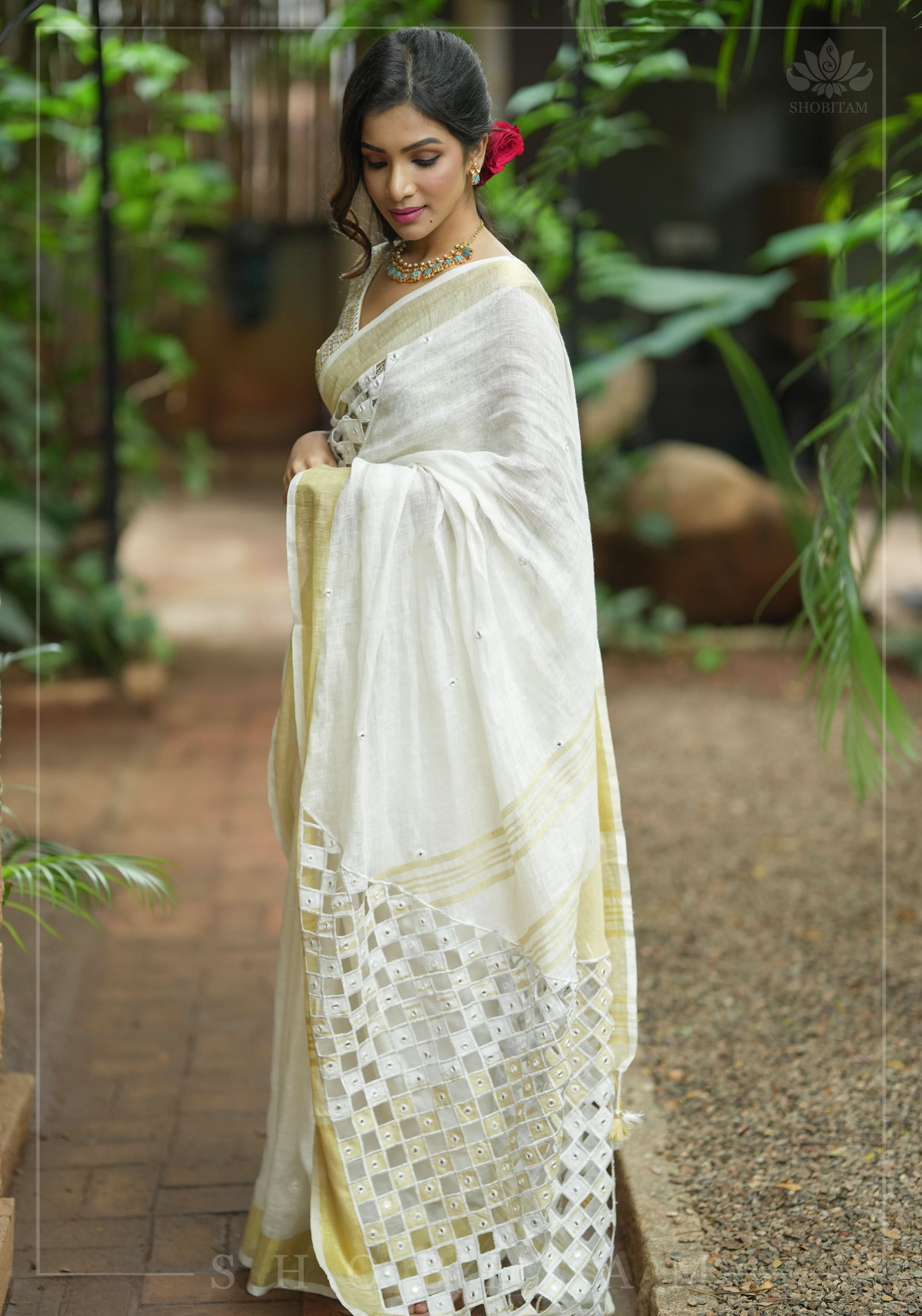 Cutwork and Mirror Work Linen by Line Saree in Chalk White | Shobitam