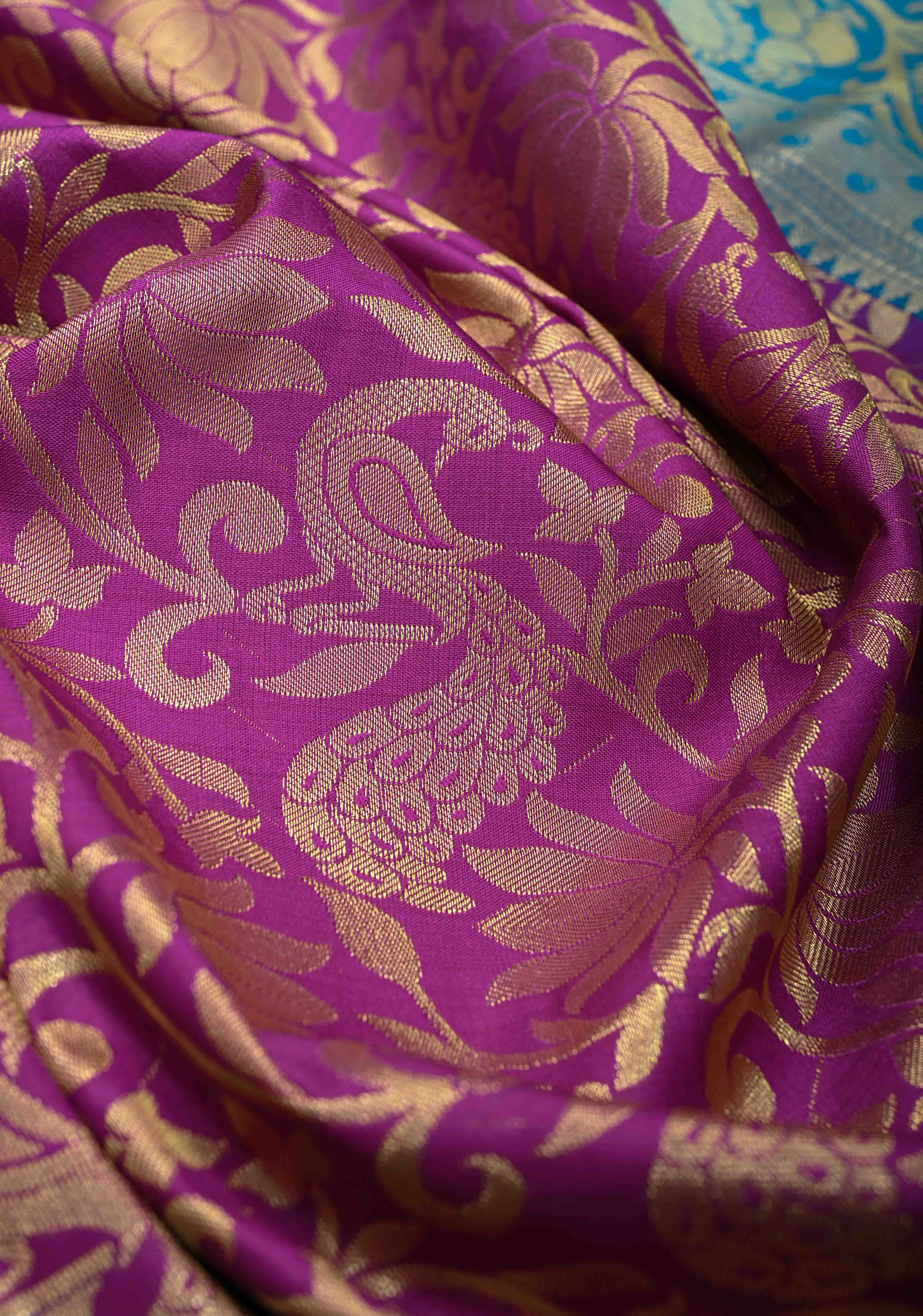 Dark Purple Semi Silk Saree in Kanchi Style with Floral Brocade Jaal and Wide Contrast Zari Border | Shobitam
