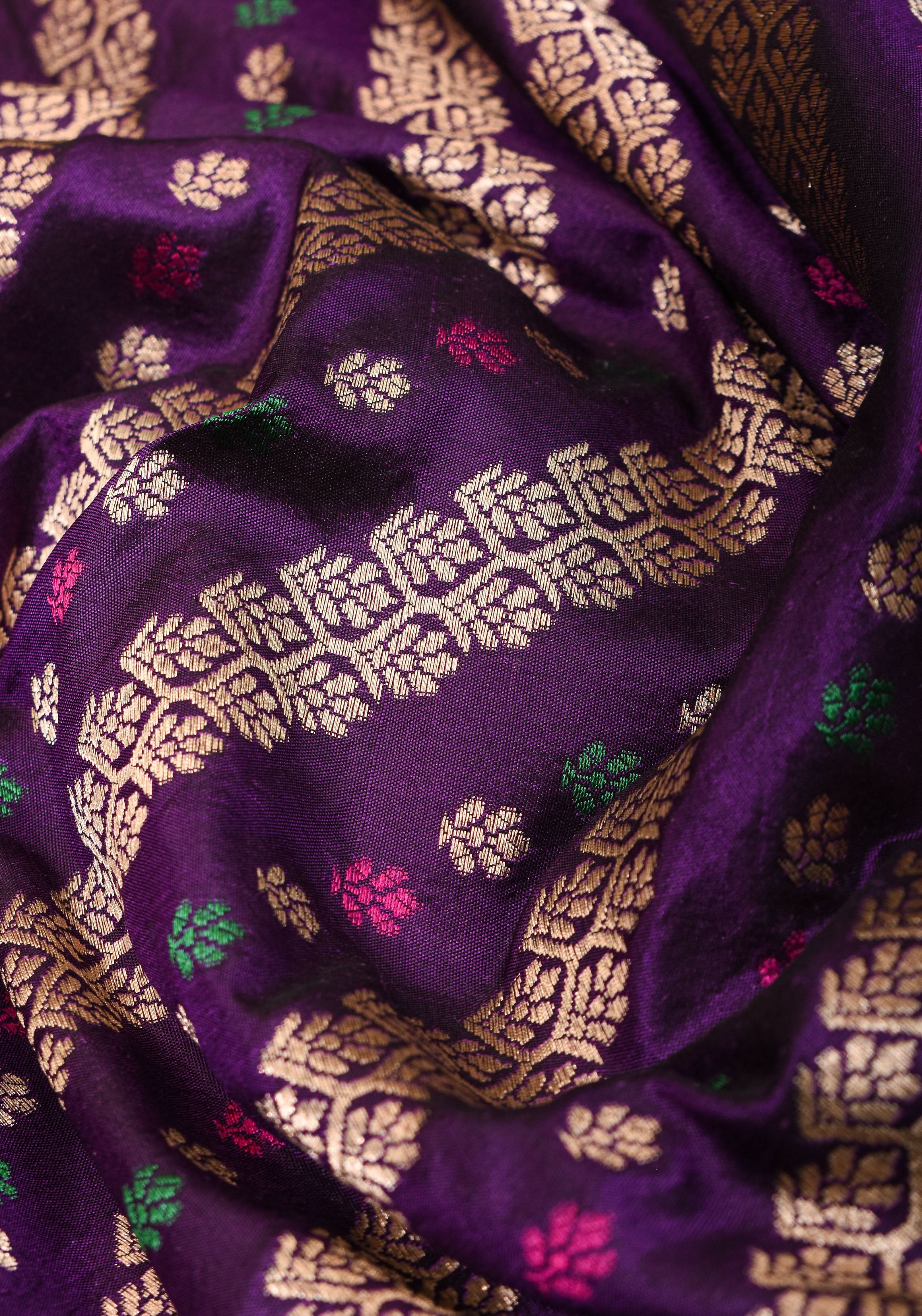 This saree has been masterfully woven in one of Varanasi's finest looms with a lustrous Katan Silk in a Purple shade that allows the zari work to flourish! The leheria or diagonal designs accentuated by meenakari resham add beauty to the saree! Magnificent Persian-inspired damask designs grace the pallu!