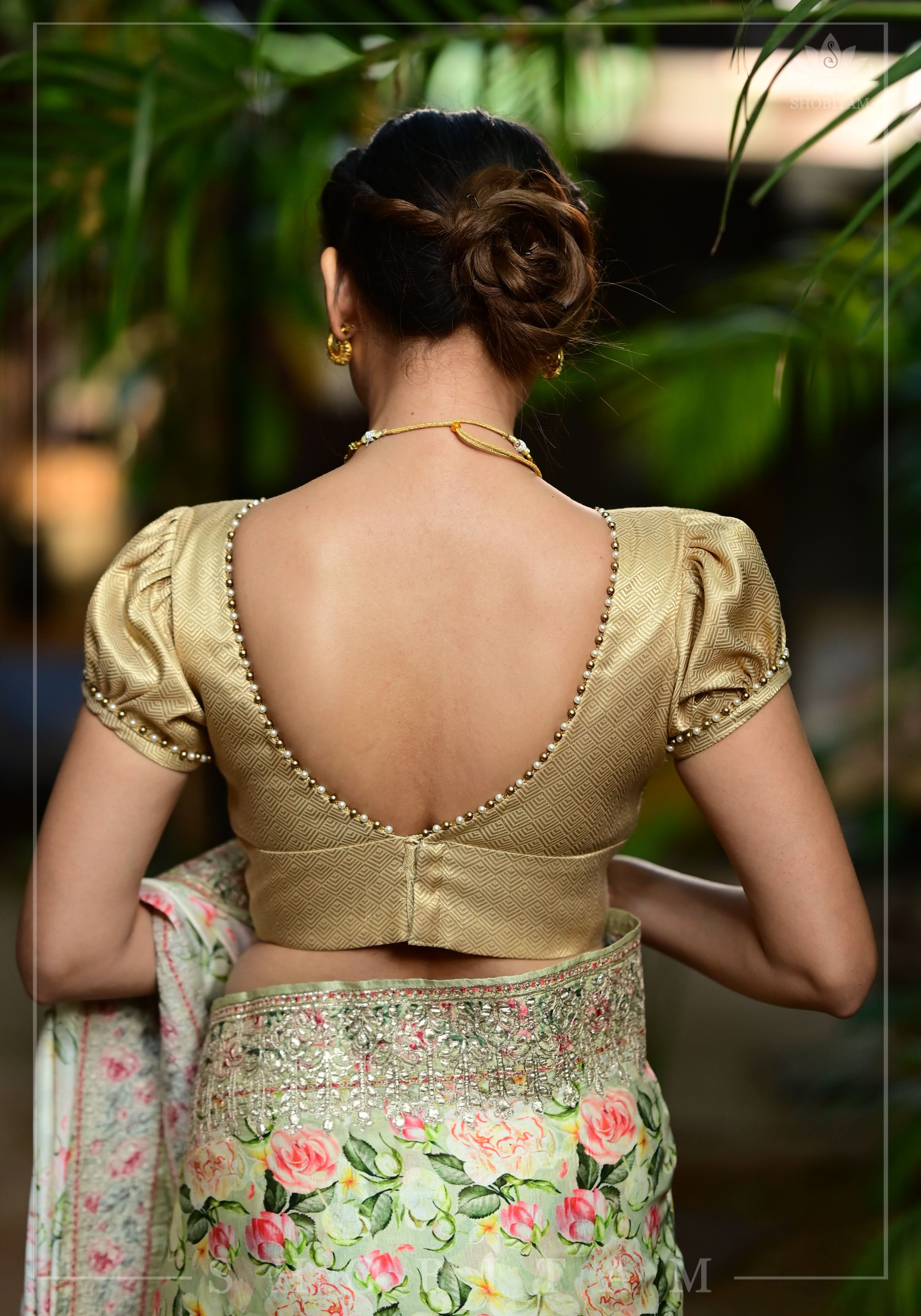 Gold tone sweetheart neck blouse with puff sleeves with beads detailing | Made to Order | Shobitam