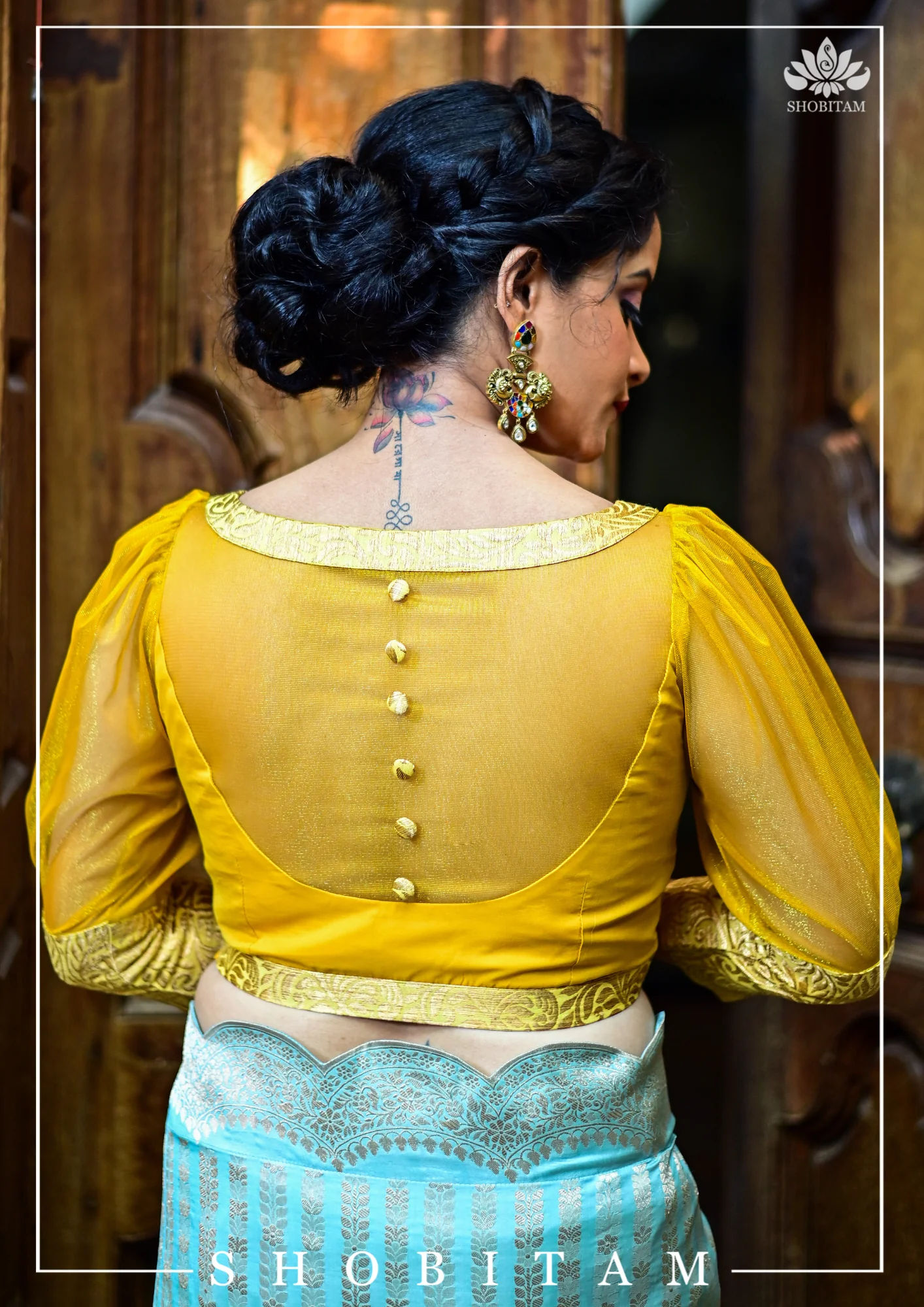 Mustard boat neck Blouse with Sheer Yoke and Puff Sleeves, Banarasi Brocade Detailing | Shobitam