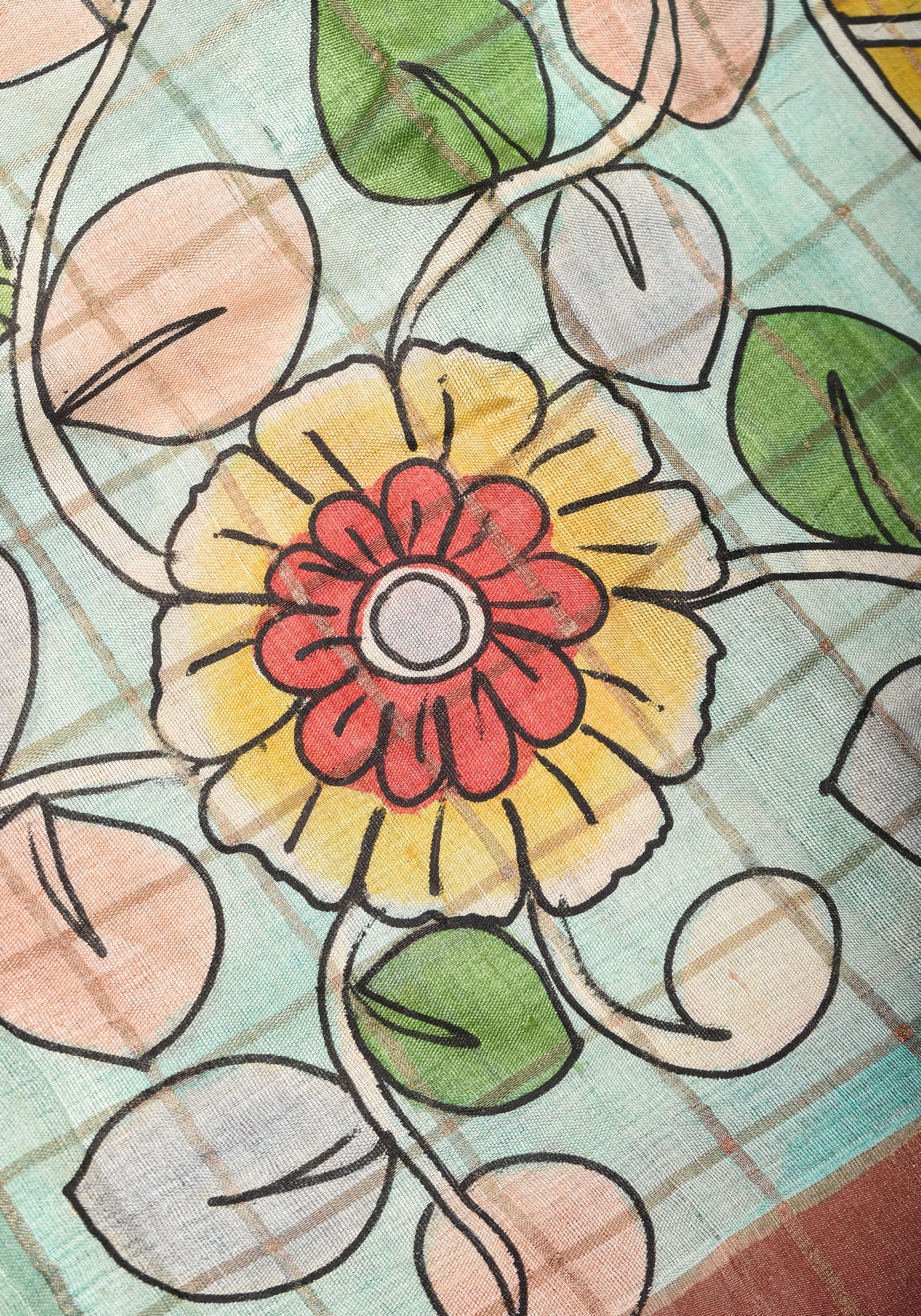 Jari Tussar Saree with Checks and Kalamkari Digital Print | SILK MARK CERTIFIED | Shobitam