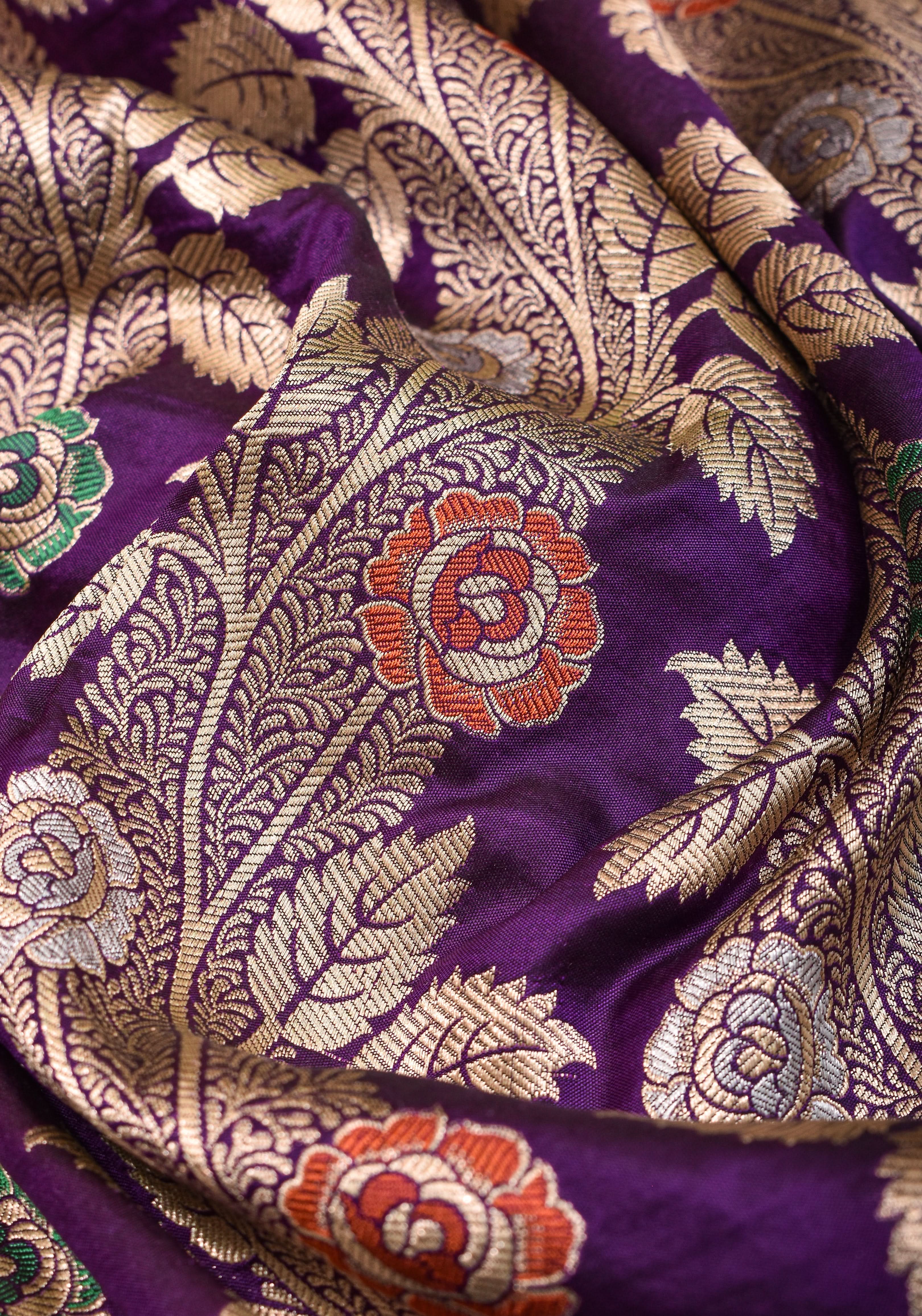 Meenakari Rose Creeper Jaal on Deep Purple Banarasi pure silk saree | SILK MARK CERTIFIED | Shobitam