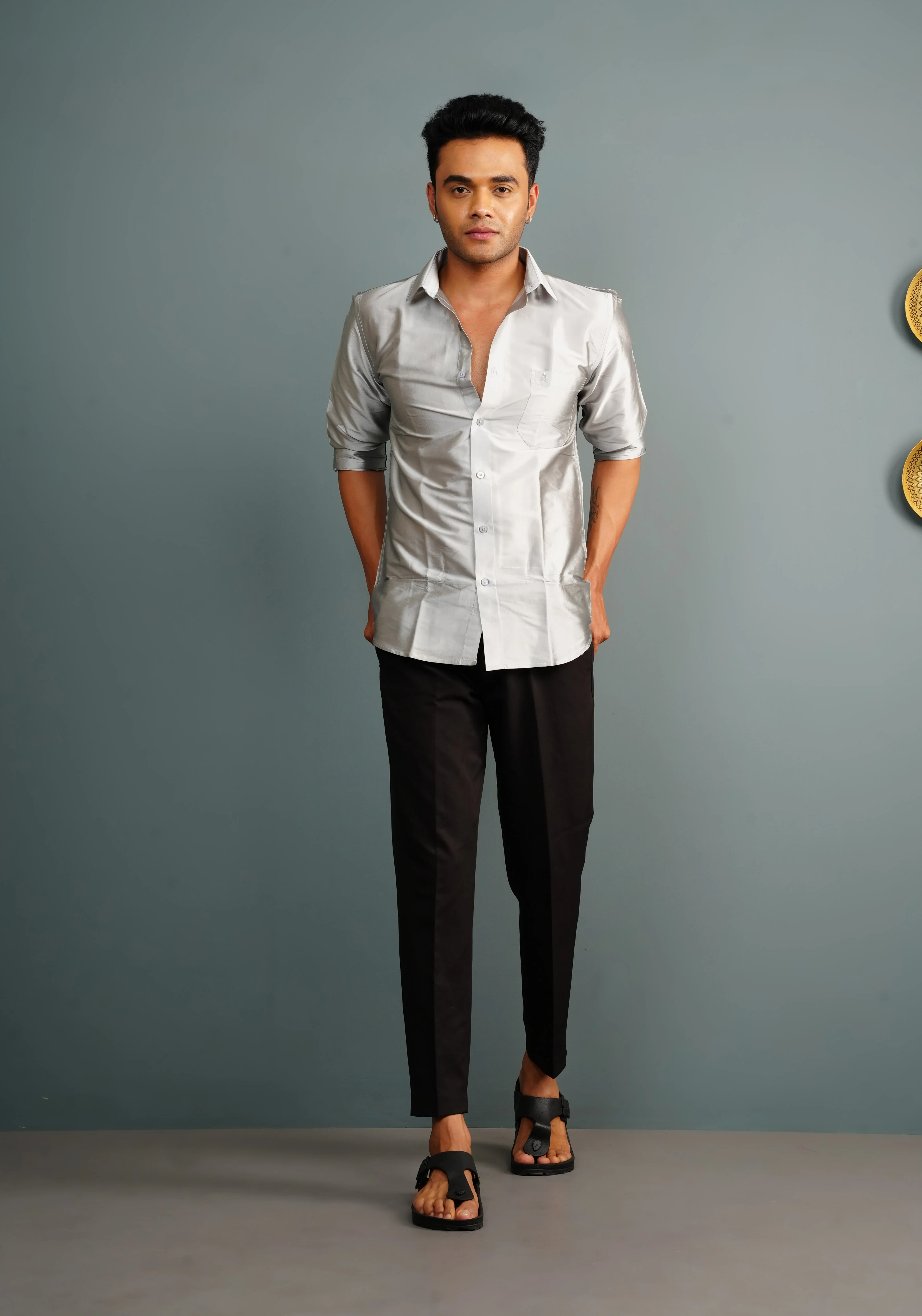 Mens Silver Color Solid Shirt for Dhoti and Trousers | Shobitam