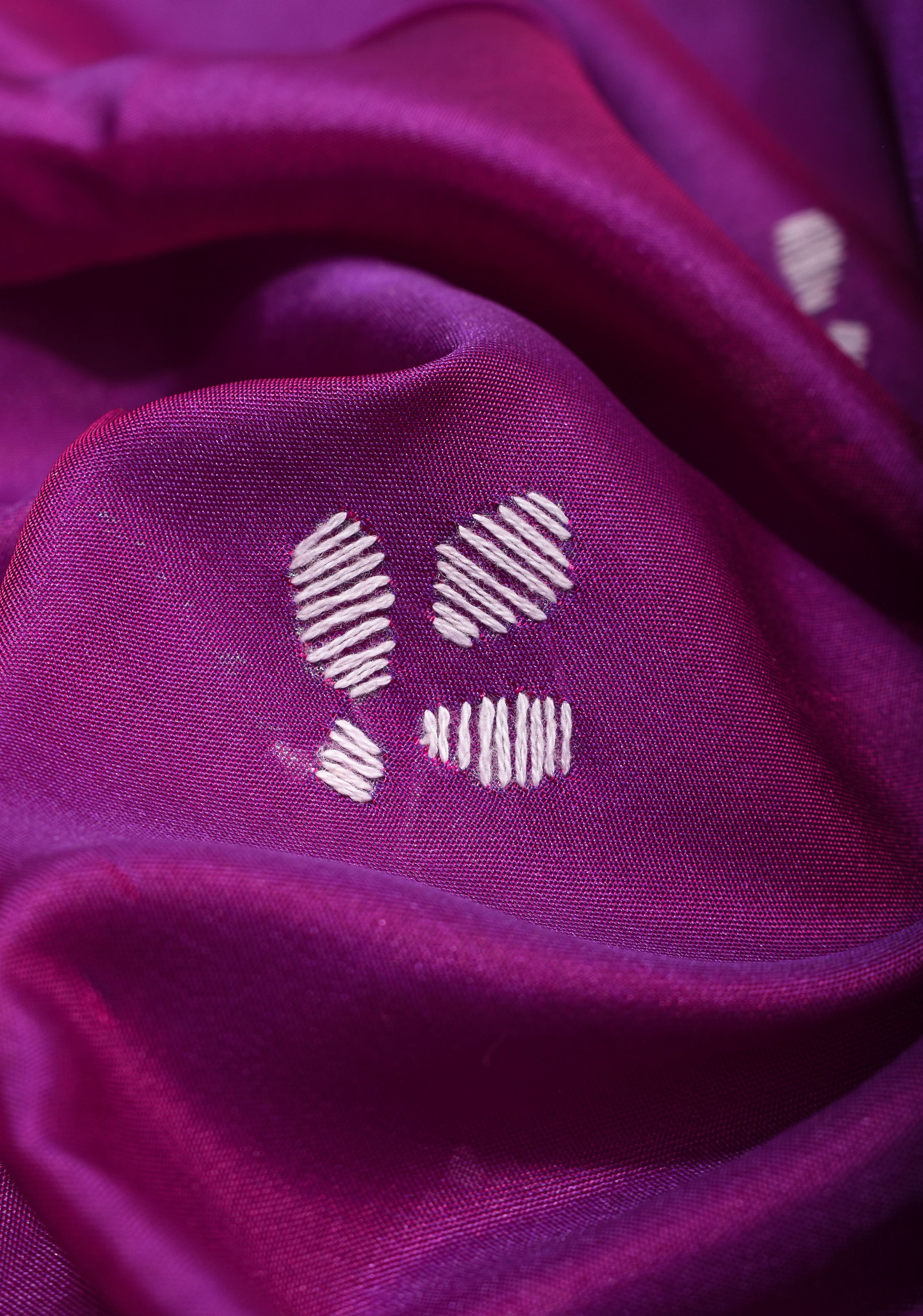 This Purple Authentic Butterfly Theme Hand Kantha Embroidery Art Silk Saree is absolutely enchanting! Imagine delicate butterflies, with their wings outstretched in flight, intricately embroidered by hand on luxurious art silk fabric.