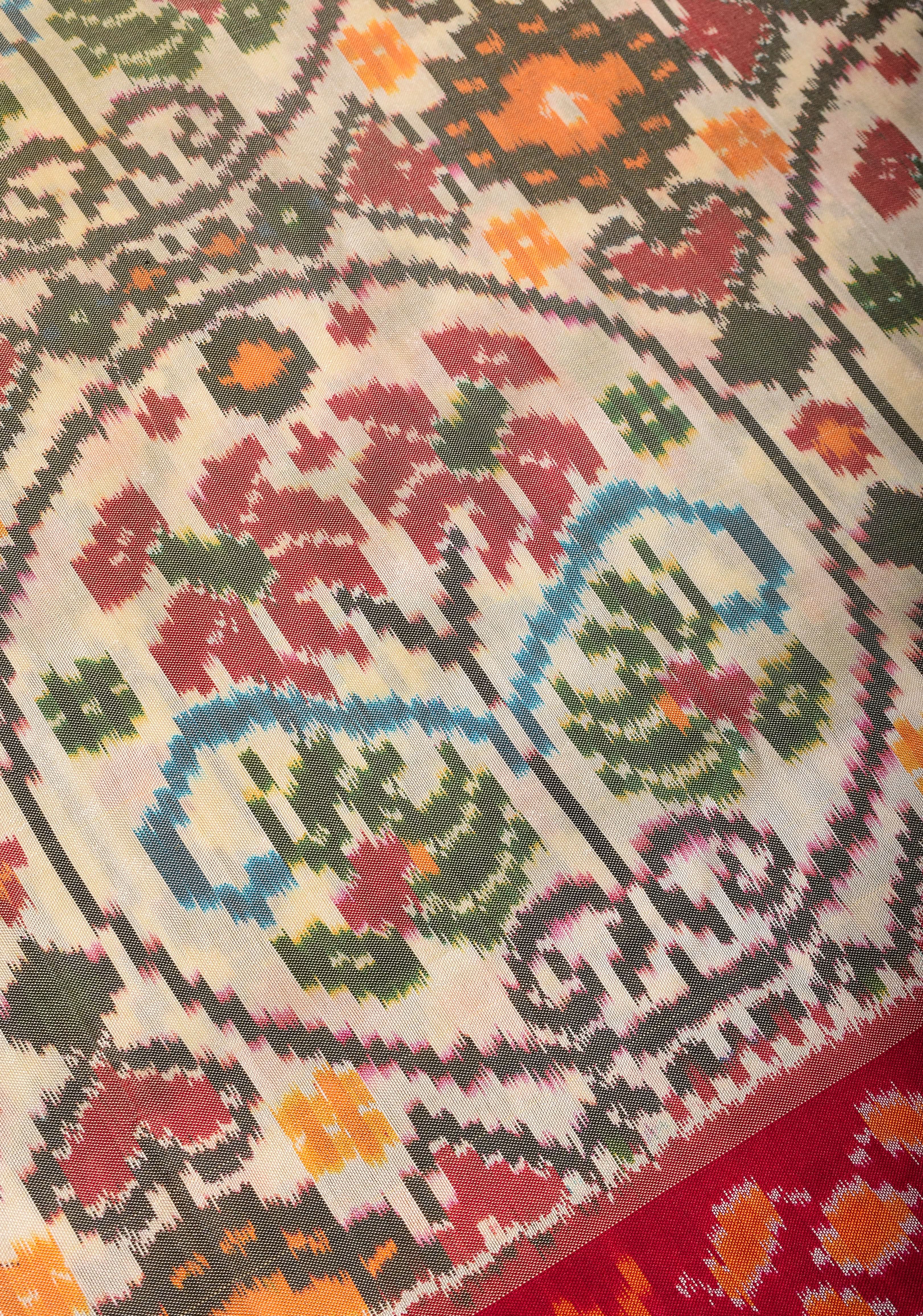 This Patola Pochampalli saree offers a stunning juxtaposition of vivid geometric patterns on white, with a stack border of traditional ikkat weaving on the pallu. The body of the saree is Ivory, providing a classic backdrop for the Ikkat designs to flourish.