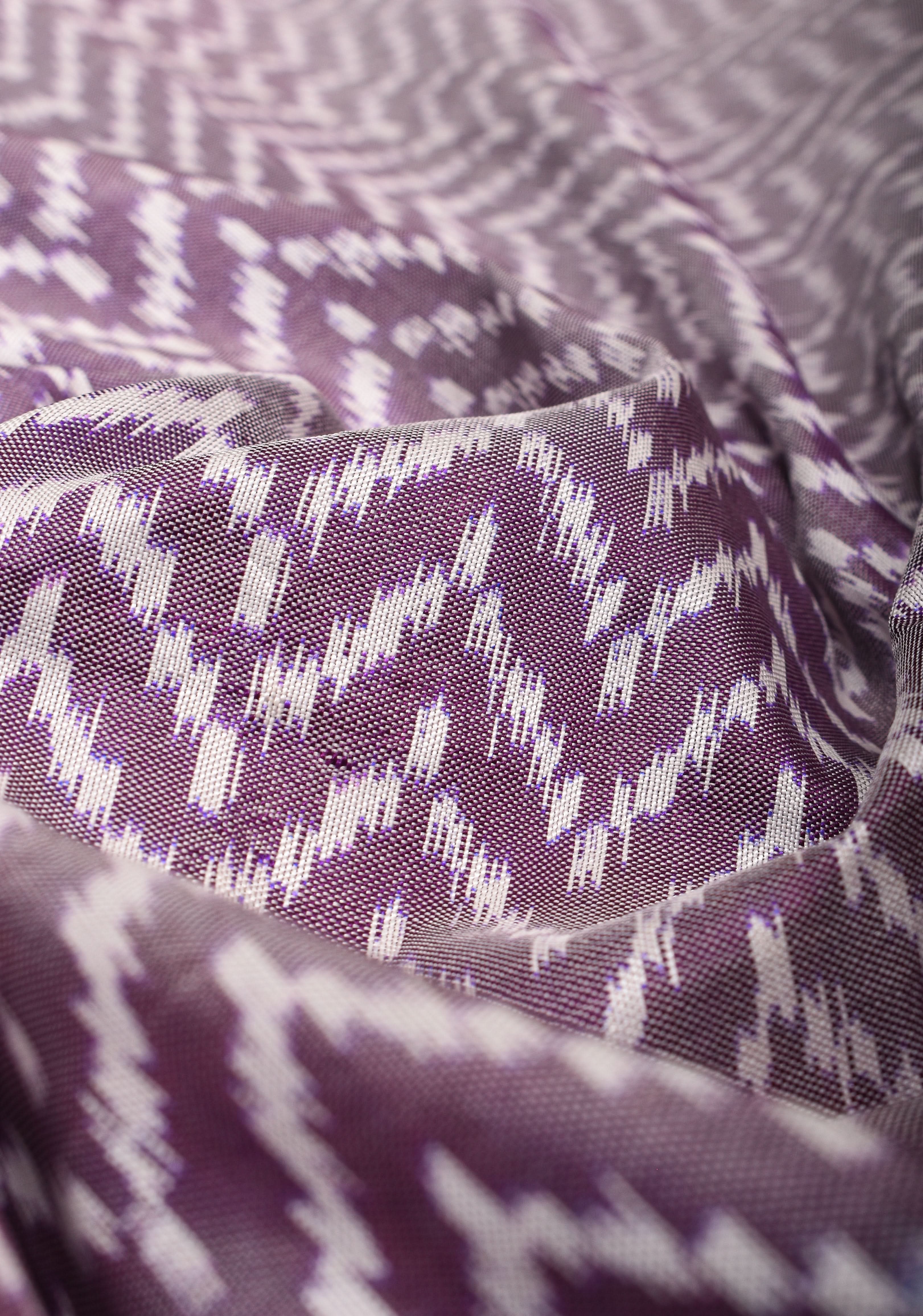 Rich Zari weaving with Zari borders showcases the beauty of the regal Kanjivaram zari weave! Prominent Ikkat panels on both sides adjacent to the zari panel make sure that the Ikkat weave stand out when you drape them and the colors gray, purple, and gold - a rare combination come together beautifully! The pallu is equally resplendent with rich zari weaving.Â
